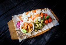 350 г • маринованные огурцы, квашеная капуста, морковь пряная, лук маринованный красный, маринованные грибы, маслины, зелень