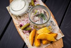 100/100/40/30/50 г • филе сельди, красный маринованный лук, маринованные огурцы, картофель запеченный, сметана, зелень