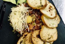 270 г • говяжья вырезка, огурец маринованный, красный лук, каперсы, ржаные гренки, яйцо перепелиное