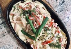 200/200 г • картофельные драники, куриное филе, лук репчатый, перец сладкий, сливки, зелень