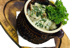 200/200 г • картофельные драники, свинина, лук репчатый, шампиньоны, сметана, зелень