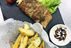 200/150/50/50 г • свинина, бекон, моцарелла, картофельные дольки, маринованный лук, фирменный соус