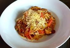 300 г • спагетти, говяжья вырезка, специи, болгарский перец, репчатый лук, сельдерей, фирменный соус, пармезан
