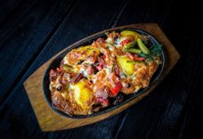 390/2 г • говяжья вырезка, картофельные дольки, сладкий перец, лук репчатый, шампиньоны, соус томатный, моцарелла, яйцо, огурец маринованный, сельдерей